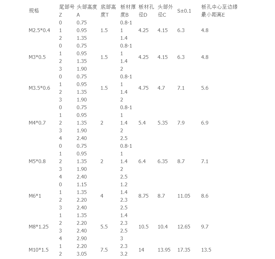 3.适用于各种厚度的板材,Zui小厚度0.8mm,使用时必须根据板材厚度和螺母规格,才能确定A尺寸对应的尾部号Z,用户根据板材厚度依据表中尾部号选样订货;